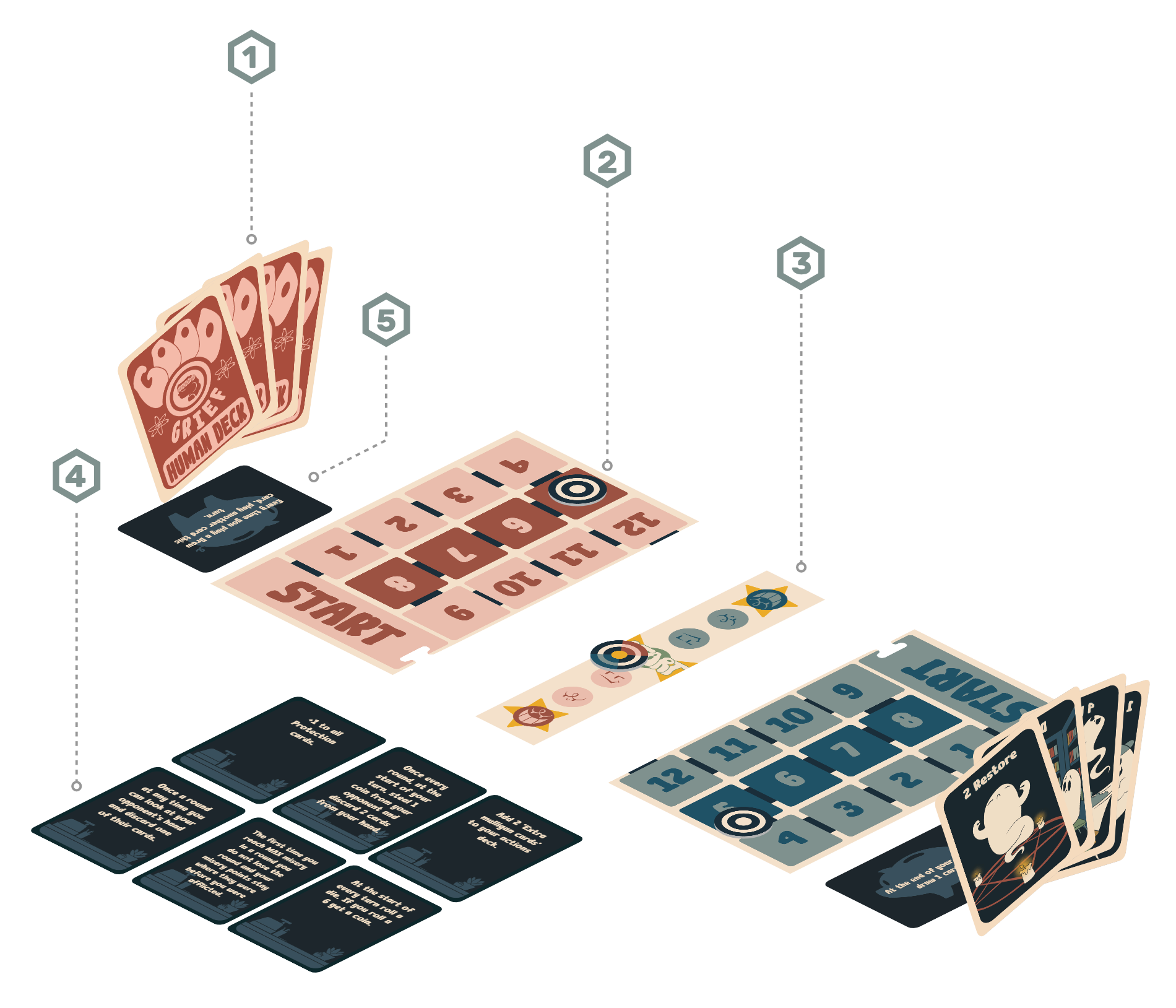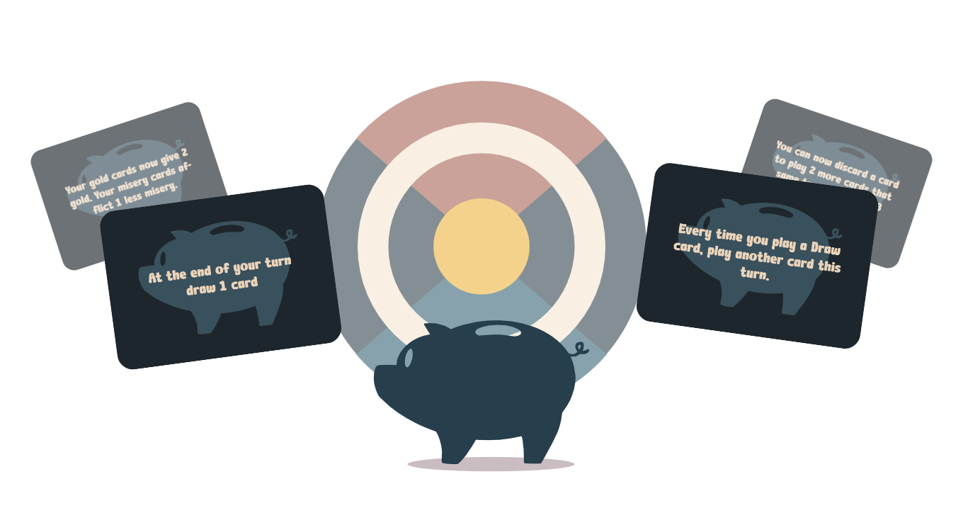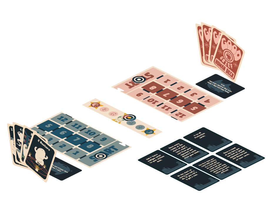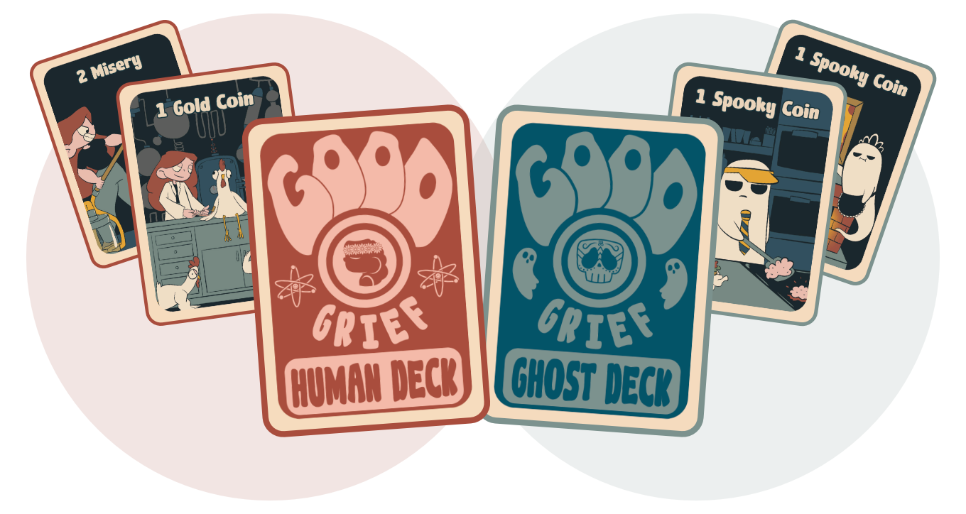 In "Good Grief," action cards drive the game. Each turn, play a card or draw extra to set up powerful combos and cause your enemy heaps of misery. Remember to collect gold, investing in griefdoms or your ultimate griefdom enhances your strength for future rounds!